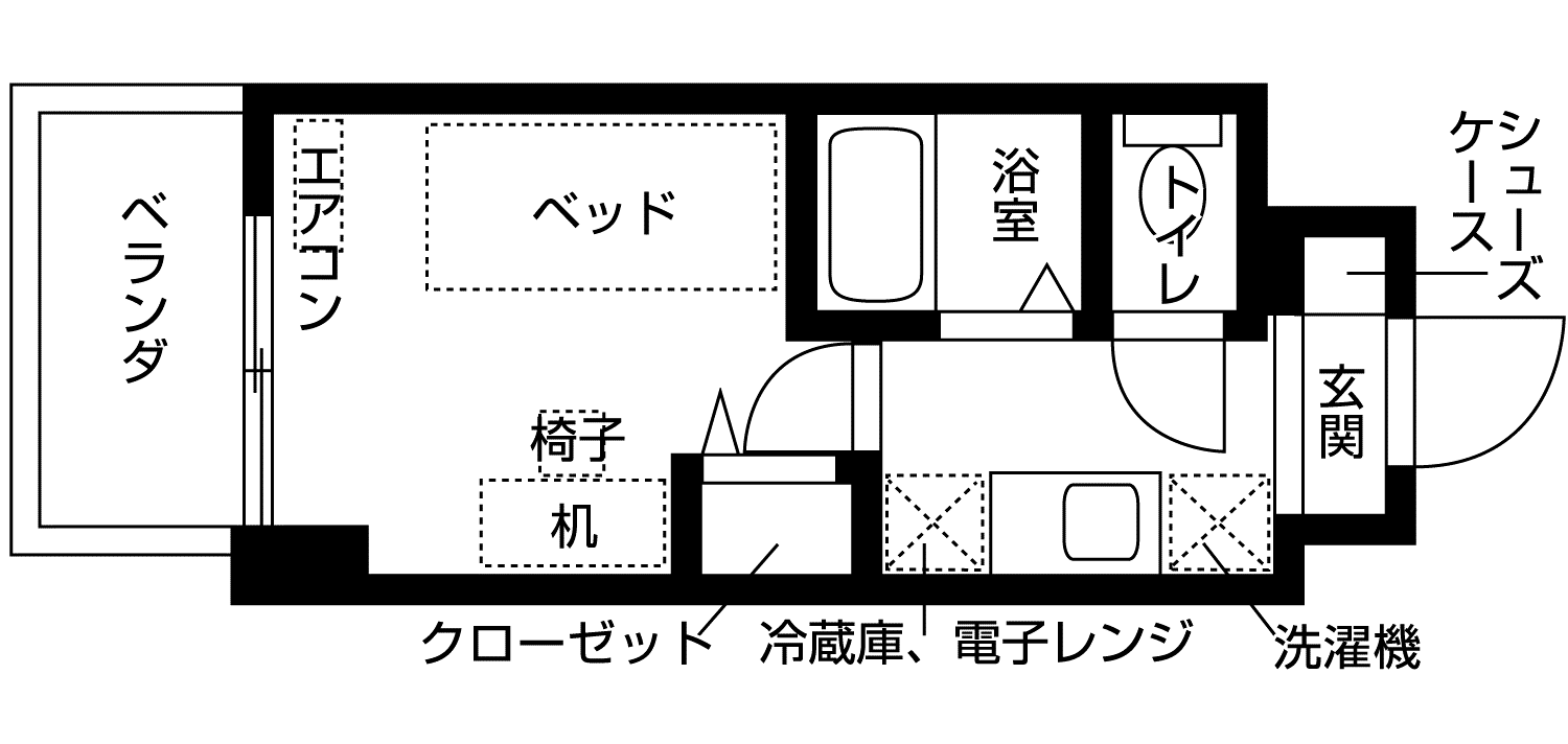 - エレベータ、 宅配ボックス、 バルコニー、 家具・家電付、 エアコン、 冷蔵庫、 照明付き、 駐輪場、 バストイレ別、 浴室乾燥機、 温水洗浄便座、 洗面所独立、 オートロック、 防犯カメラ、 ゴミ出し24時間OK