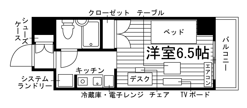 - 宅配ボックス、 バルコニー、 フローリング、 家具・家電付、 エアコン、 冷蔵庫、 照明付き、 耐震構造、 駐輪場、 シャワー、 冷房、 シューズボックス、 オートロック