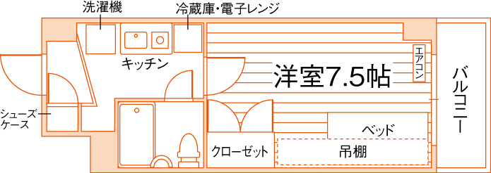宅配ボックス、 バルコニー、 フローリング、 家具・家電付、 エアコン、 冷蔵庫、 照明付き、 CATV、 駐輪場、 シャワー、 冷房、 シューズボックス、 オートロック、 防犯カメラ、 24時間緊急通報システム